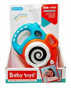 Zabawka aparat fotograficzny z efektem świetlnym i dźwiękowym. Zapakowany w kartonowe pudełko. Zabawka przeznaczona dla dzieci od 18 miesiąca życia. Zabawka działa na baterie typu AAA. Baterie nie są załączone do zabawki. Podane wymiary są wymiarami opakowania.