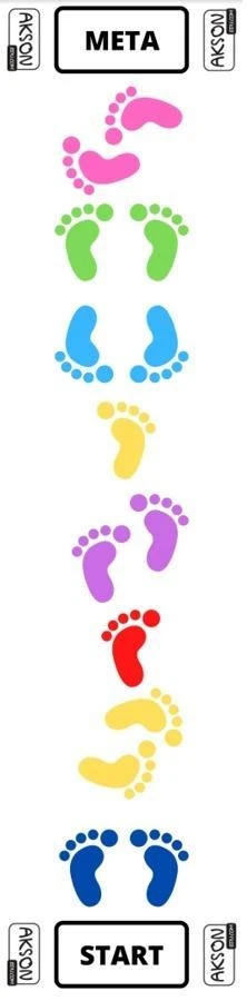 Kolorystyka: biała mata z nadrukiem stópek w różnych kolorach i polami "META" i "START"