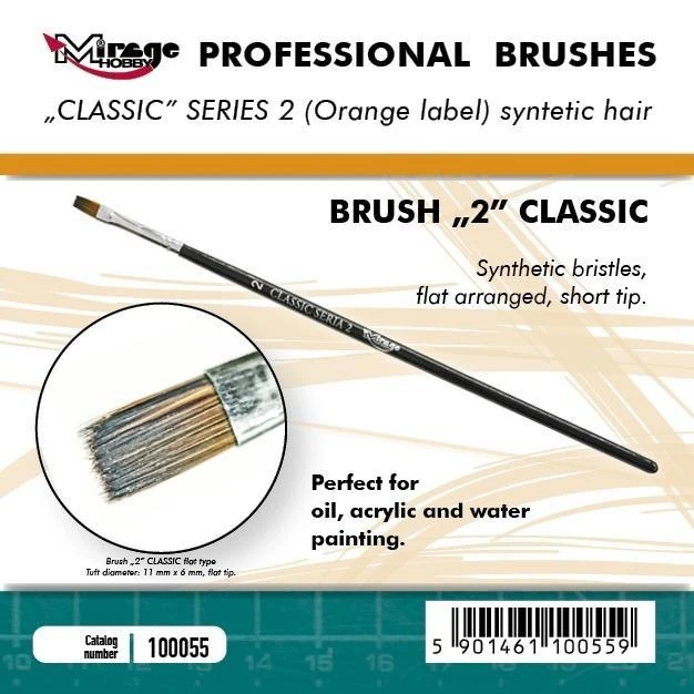 Mirage Hobby Pędzle Płaskie PROFESSIONAL Seria płaskich pędzelków o wysokiej jakości syntetycznym włosiu i krótkim trzonku. Pędzle z serii PROFESSIONAL Seria 2 idealnie nadają się do malowania po różnych powierzchniach. Idealne do pracy ze wszelkiego rodzaju farbami akrylowymi, olejnymi, wodnymi etc