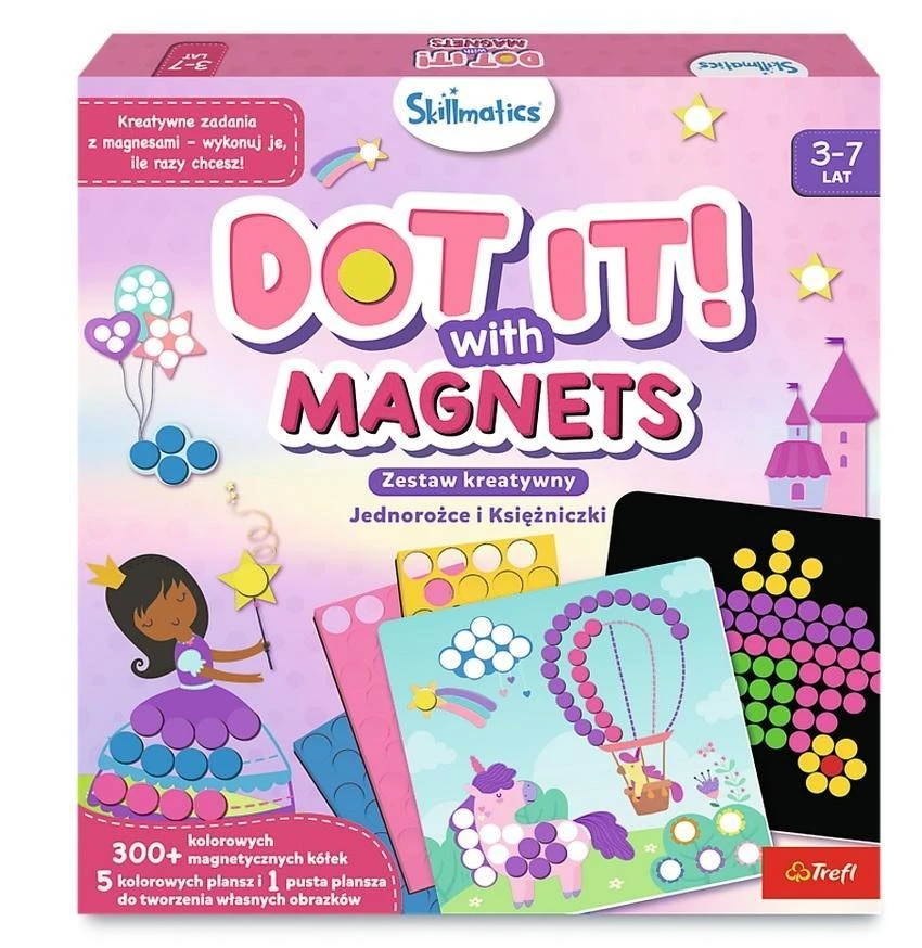Zestaw Skillmatics Dot It! With Magnets Jednorożce i Księżniczki to doskonała propozycja dla małych artystów. Dzięki ponad 300 magnetycznym kółkom dziecko może rozwijać małą motorykę, ćwiczyć koordynację ręka-oko i puścić wodze fantazji, wypełniając 5 bajkowych plansz z motywami księżniczek i jednorożców.